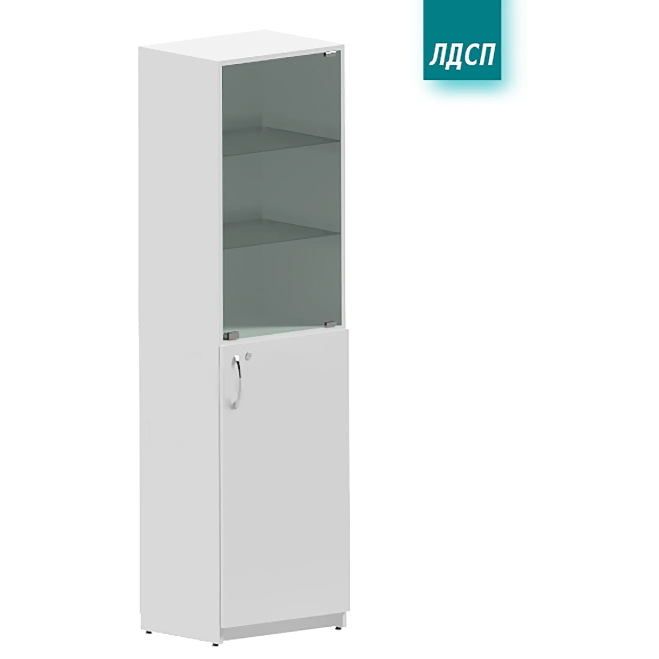 • Нижняя дверца из ЛДСП, верхняя дверца из стекла, 2 полки (в нижней секции) из ЛДСП, 2 полки (в верхней секции) из стекла