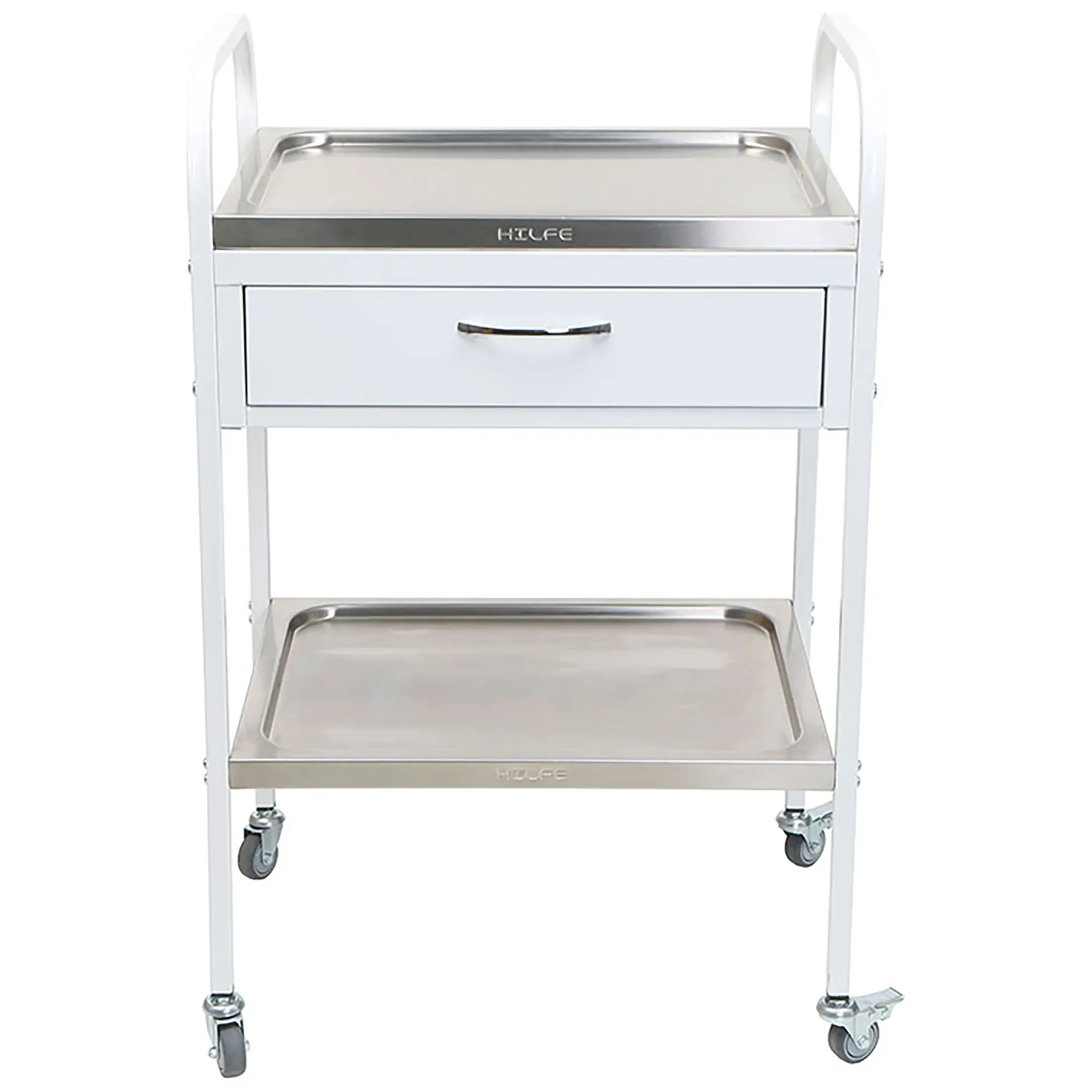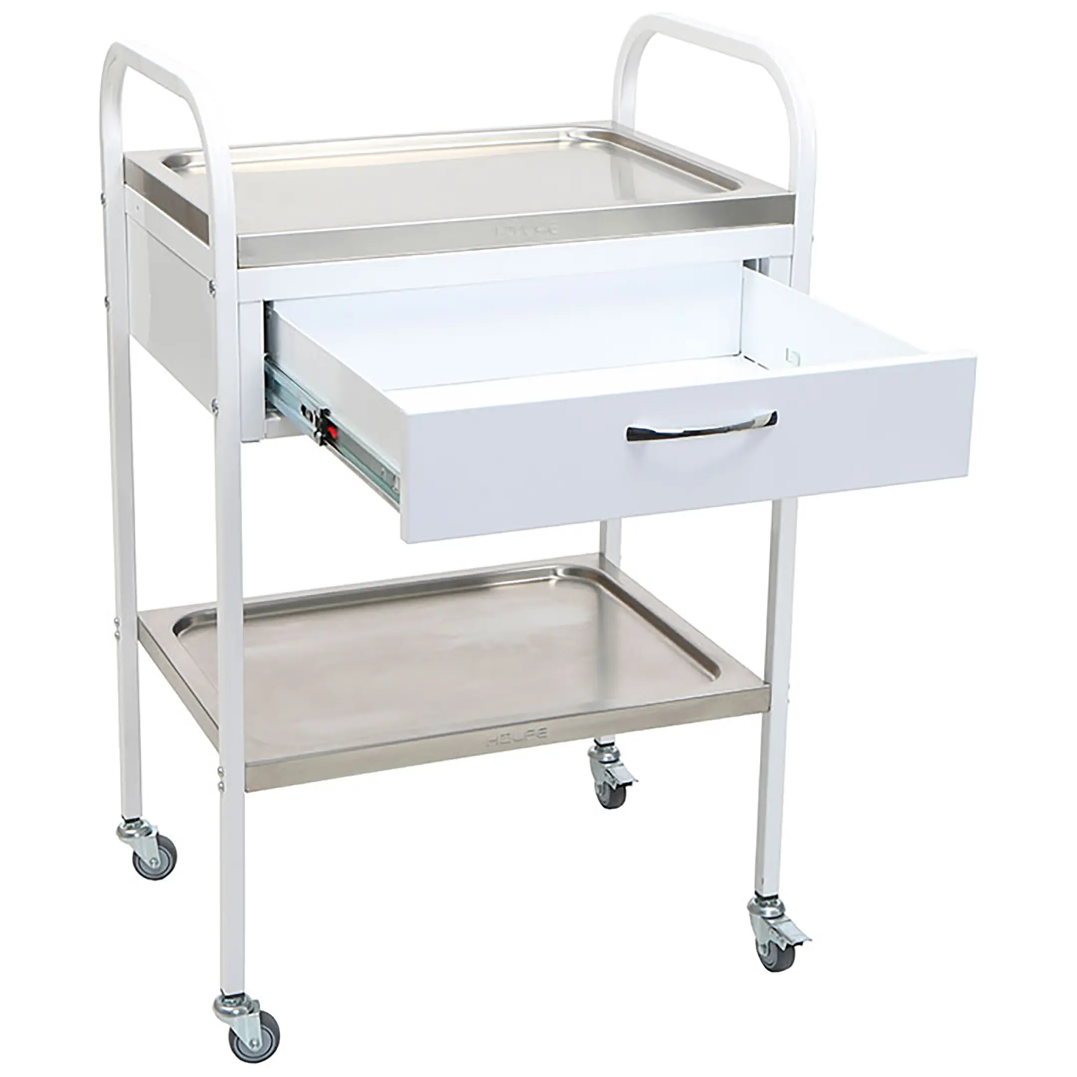 • столик процедурный имеет 4 колеса из немаркой резины, D= 50 мм. Два колеса снабжены тормозом;