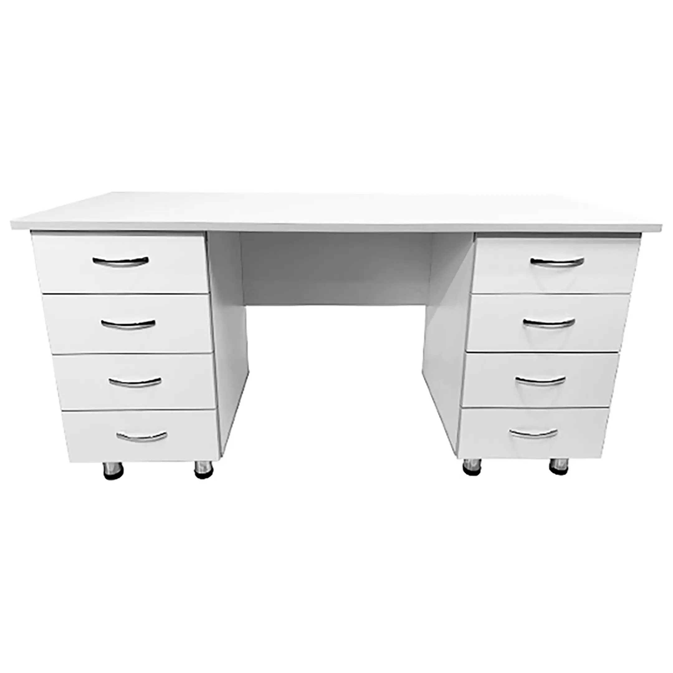 • Ключевая особенность данной модели - наличие двух боковых тумб, каждая из которых оснащена четырьмя выдвижными ящиками. Это предоставляет удобное и организованное хранение документов, инструментов и других необходимых материалов. Сочетание белого цвета ЛДСП с светло-серой кромкой создает стильный и современный внешний вид стола.