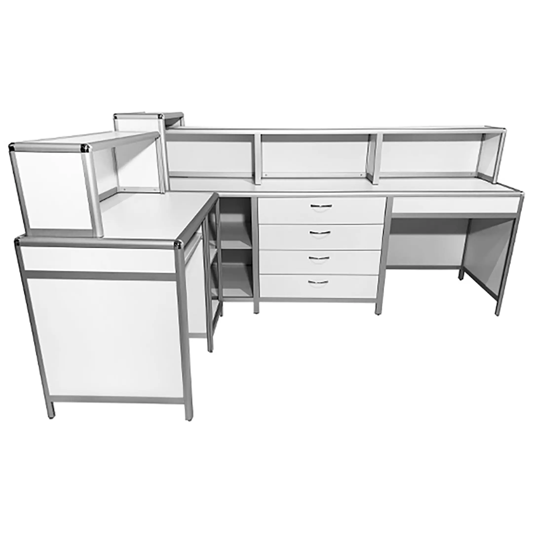 - Качественные материалы — обшивка из ЛДСП 8 мм, столешницы из ЛДСП 16 мм белого цвета, устойчивые к влажной уборке и обработке дезинфицирующими средствами.