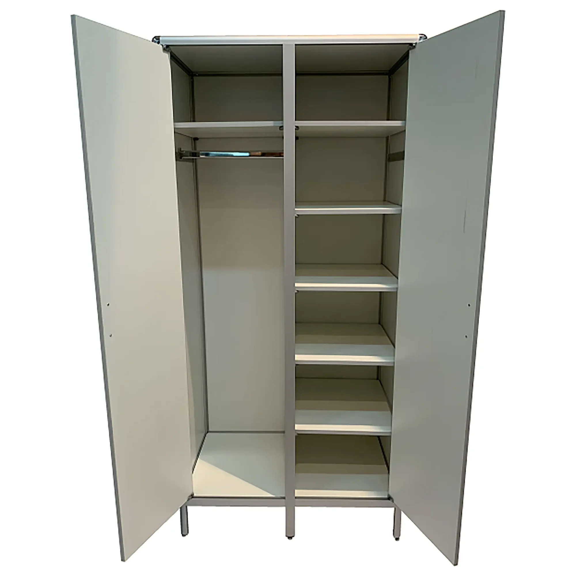 - Специализированное хранение — штанга для вешалок и полка для головных уборов обеспечивают удобное размещение лабораторной одежды.