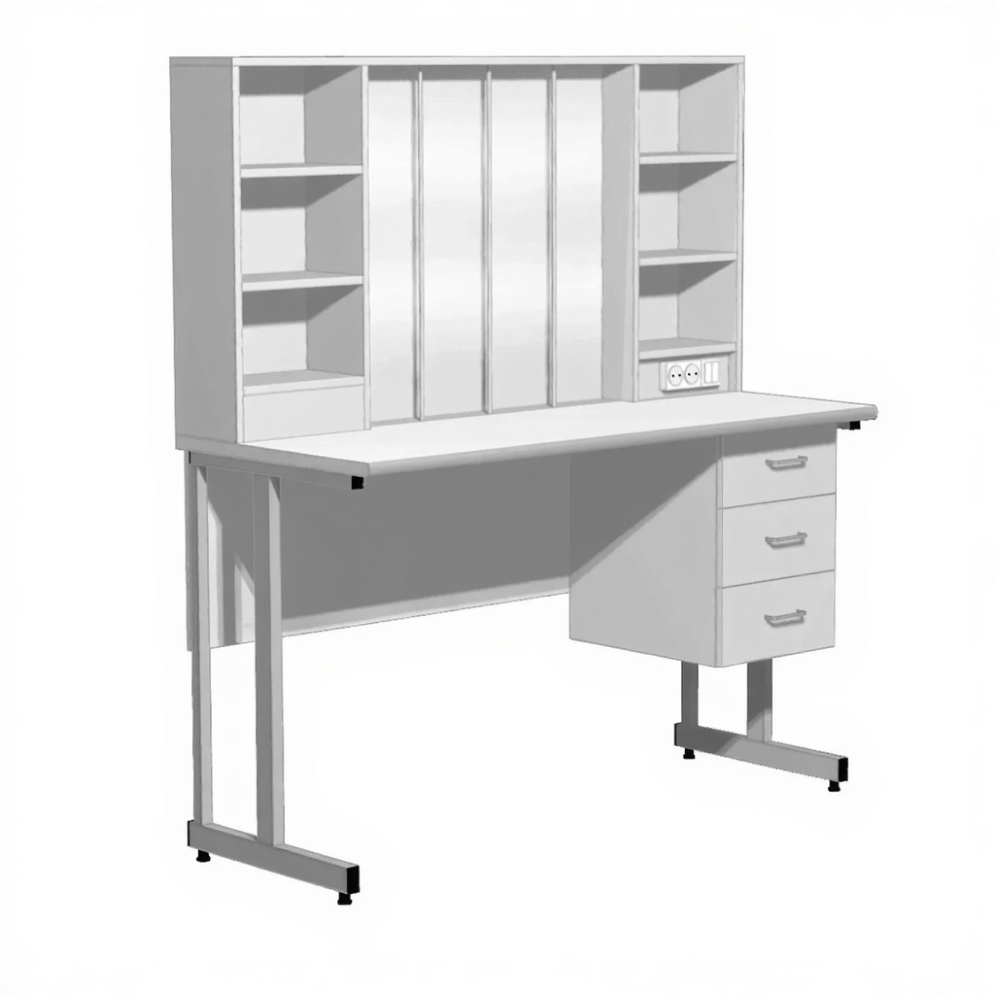 - Функциональная надстройка — зона для титрования со стойками для бюреток 3 шт. (пруток 10 мм), стеклянный экран, подсветка, розетки и выключатель.