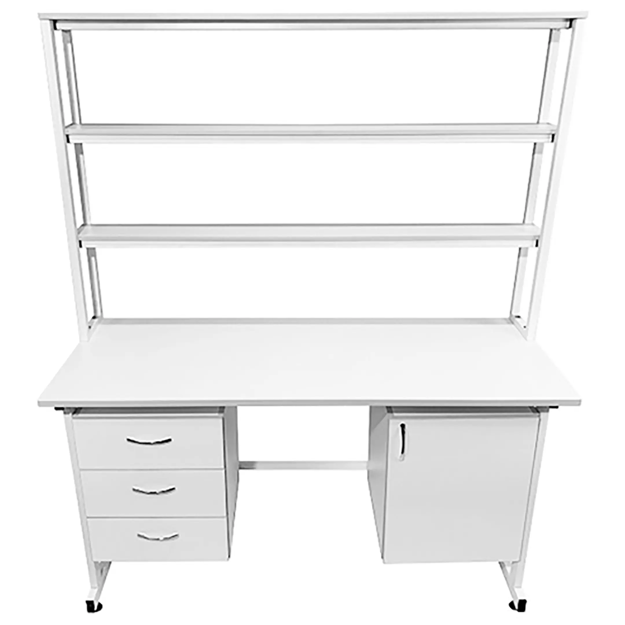 Стол лабораторный с надстройкой СЛн 16.009 (белый) — это идеальное решение для создания удобного и функционального рабочего места лаборанта, занимающегося химическими исследованиями. Модель оснащена двумя подвесными тумбами: слева с тремя выдвижными ящиками, справа с распашной дверкой и полкой, а также надстройкой с тремя полками и металлическим защитным экраном. Каркас выполнен из стального профиля, столешница из ЛДСП толщиной 22 мм.