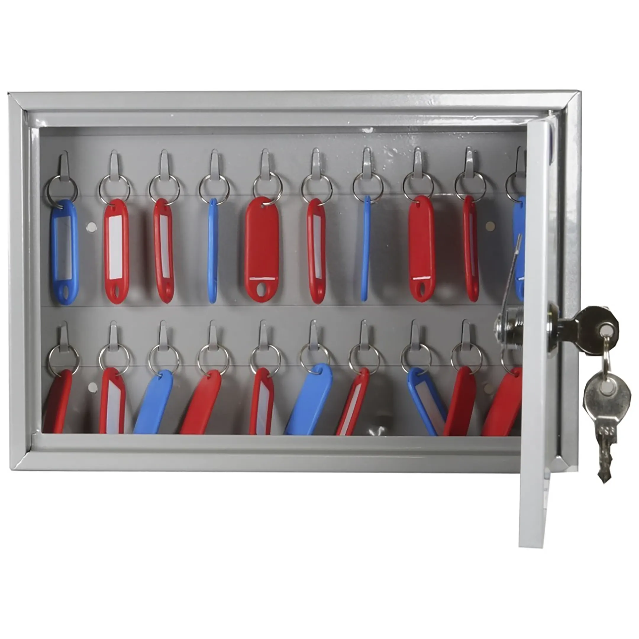 - Компактные габариты и точная вместимость — шкаф рассчитан на хранение 20 ключей, что является идеальным решением для мест, где требуется организовать строгий учет ограниченного, но важного набора ключей: от служебных помещений и сейфов до оборудования и личных шкафчиков. Его небольшие размеры позволяют легко разместить шкаф на стене в кабинете, на посту вахтера или у администратора.