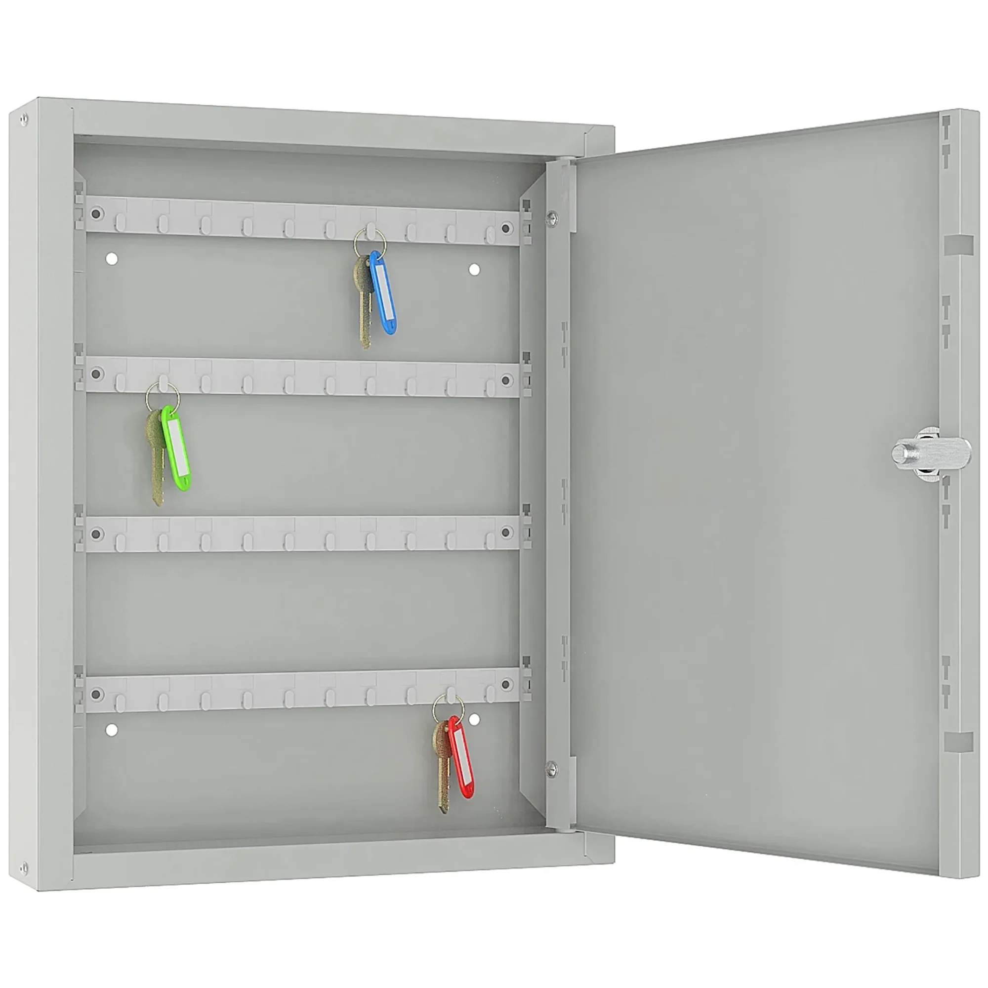 - Базовая, но эффективная защита — прочный металлический корпус с замком обеспечивает защиту ключей от случайного повреждения, потери или несанкционированного доступа посторонних лиц. Это важный элемент для контроля доступа в служебные помещения, архивы или к оборудованию.