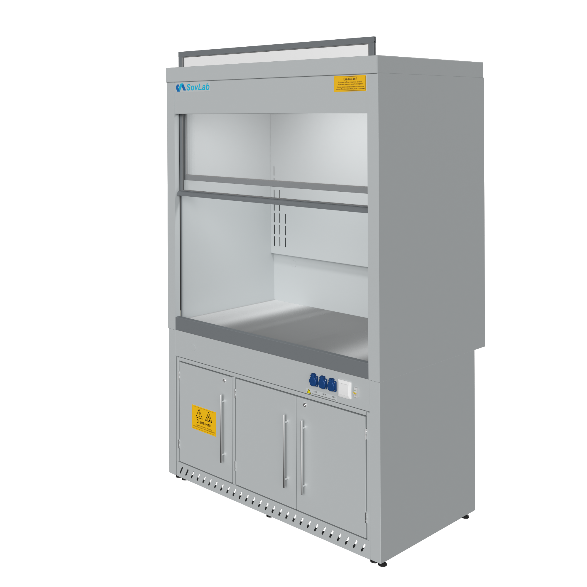 - Безопасная работа с летучими веществами — вертикально-подъемный защитный экран из ударопрочного стекла «Триплекс» с системой противовесов для плавного хода и фиксации на любой высоте.