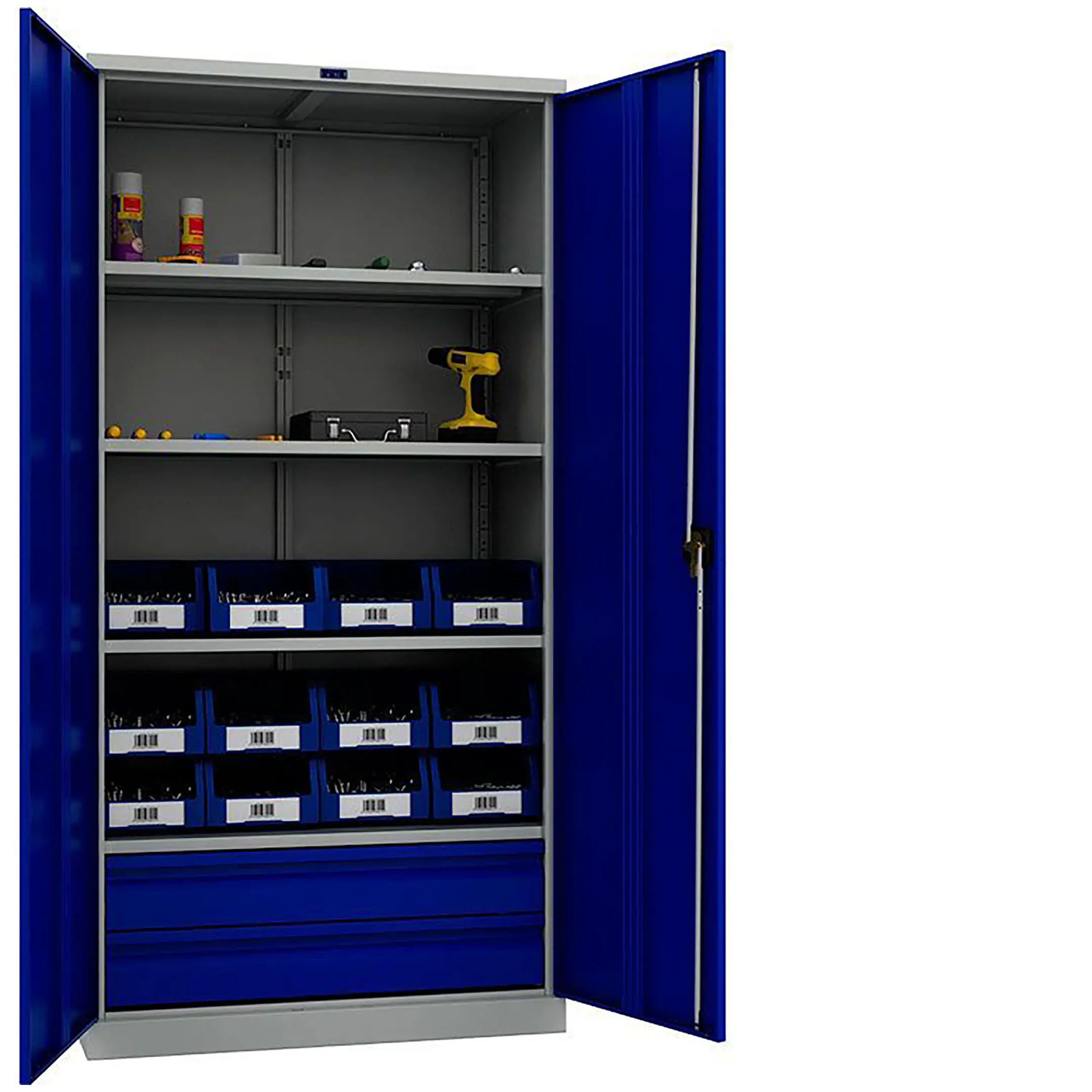 - Повышенная защита и безопасность — прочный корпус из стали повышенной толщины и усиленная конструкция дверей с надежной запорной системой (часто — центральный замок с несколькими точками запирания) обеспечивают максимальную защиту ценного инструмента от кражи и несанкционированного доступа.