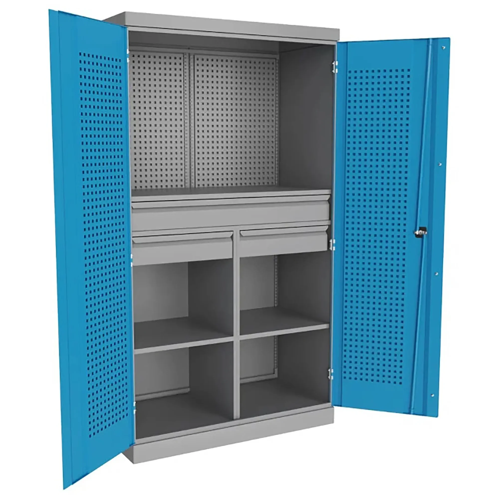 - Оптимизированная организация и высокая вместимость — шкаф сочетает различные типы систем хранения: запирающиеся верхние отделения с полками для крупногабаритного оборудования и несколько выдвижных ящиков с разной высотой фасада для мелкого и среднего инструмента, крепежа и измерительных приборов. Это позволяет рационально рассортировать весь арсенал по типам, размерам и частоте использования, максимально эффективно используя объем.