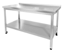 Стол производственный с бортом серия ЭКО 2, столешница: нерж. сталь марки AISI 430, толщина 0,8 мм; каркас разборный, нержавеющий уголок 1,5 мм толщиной, полка сплошная нерж.сталь.