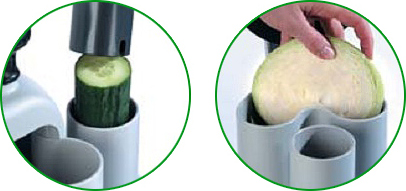 Настольная овощерезка ROBOT COUPE CL30 Bistro снабжена 2 загрузочными отверстиями. D-образная воронка предназначена для подачи на диск-терку или слайсер зелени, колбас, томатов, твердого сыра. Круглое загрузочное отверстие диаметром 58 мм используют для измельчения цукини, кабачков, ветчины и др. продуктов.