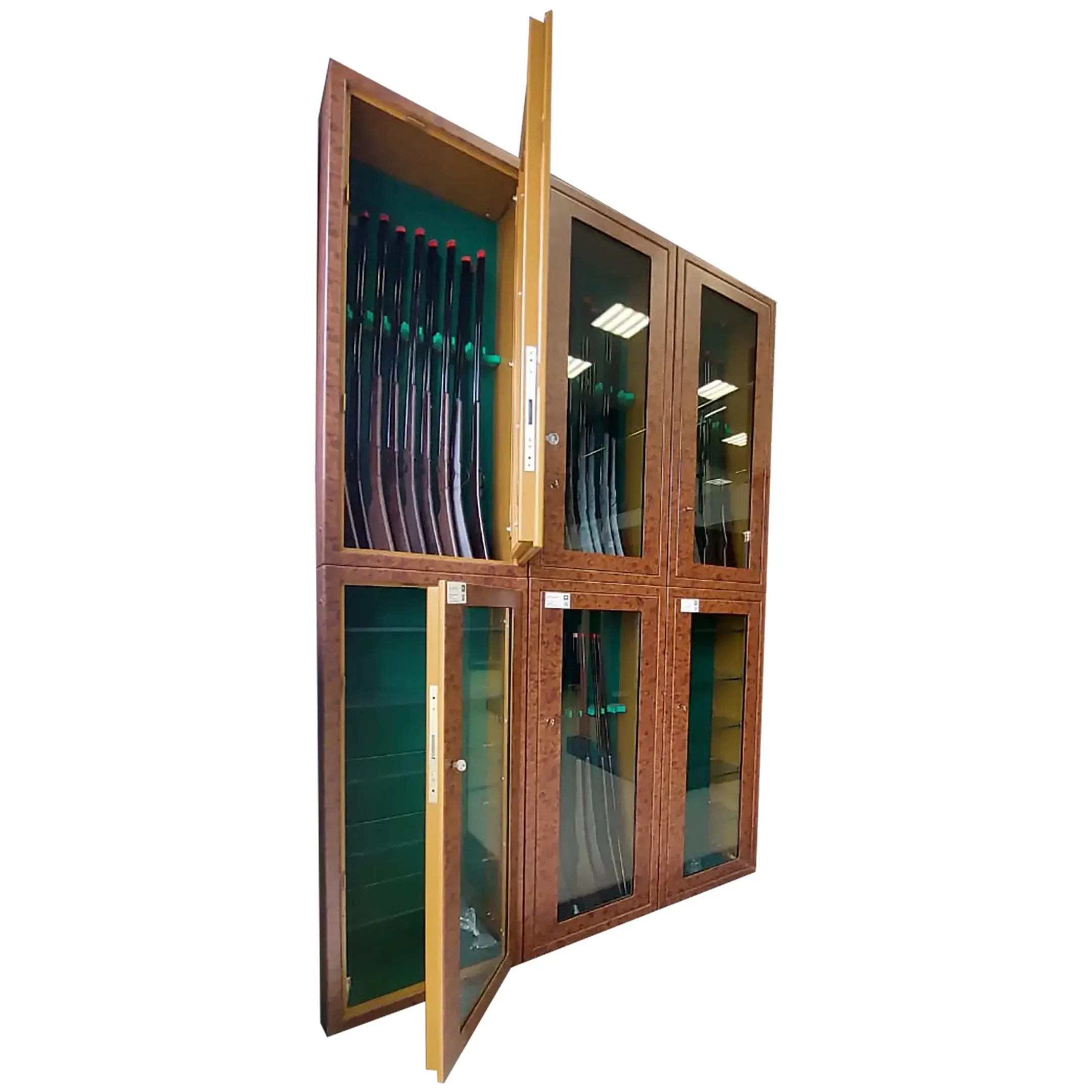 Сейф рассчитан для хранения 20 стволов. Сейф изготовлен в виде витрины, стекло установлено бронированное. Модульная система дает возможность составлять разные комбинации, при различных задачах в дизайне интерьера.