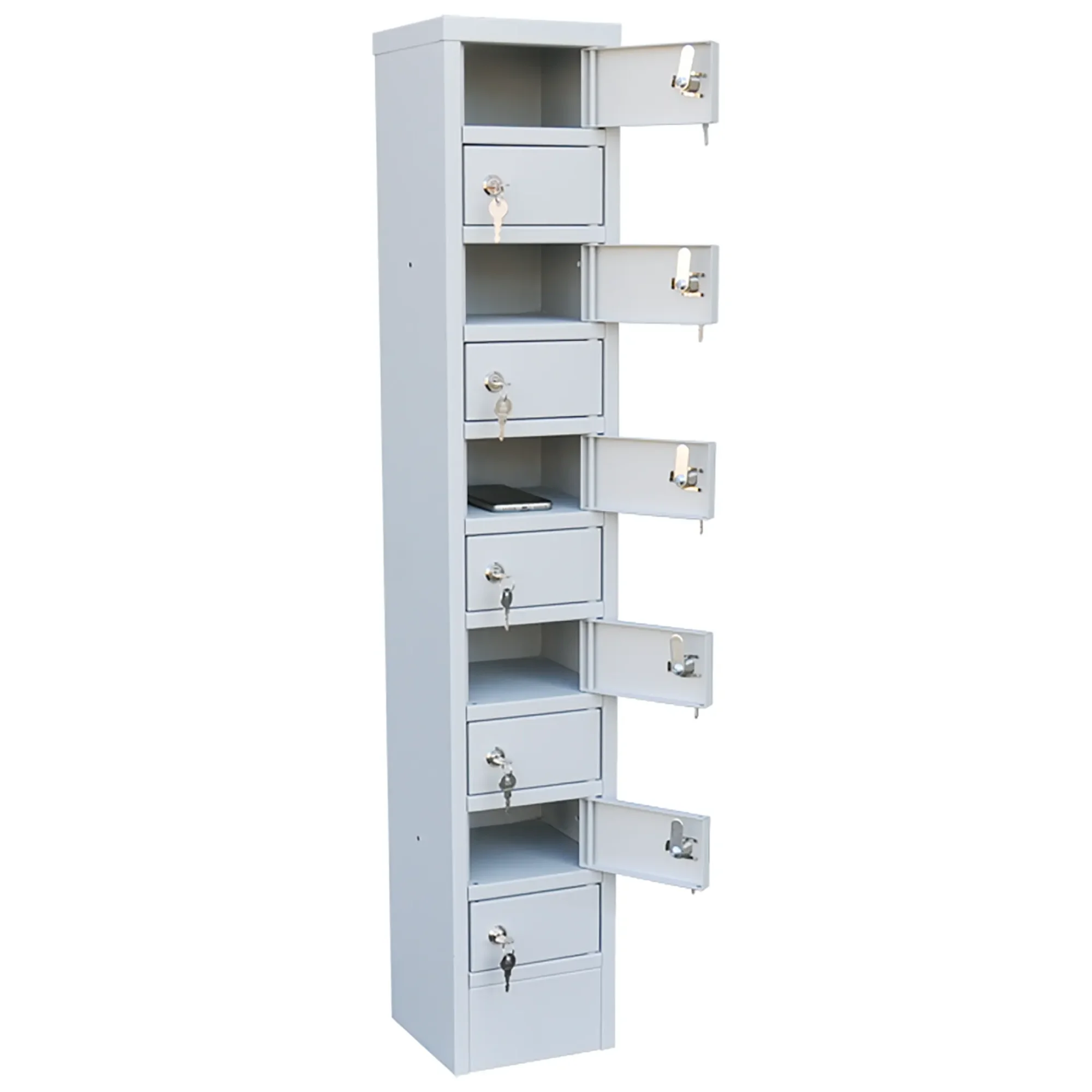 - Максимальная компактность и экономия пространства — шкаф предоставляет 10 индивидуальных запирающихся ячеек, занимая при этом минимальную площадь. Его можно легко разместить на краю рабочего стола, прилавке, полке или в нише, что делает его идеальным для мест, где каждый сантиметр на счету.