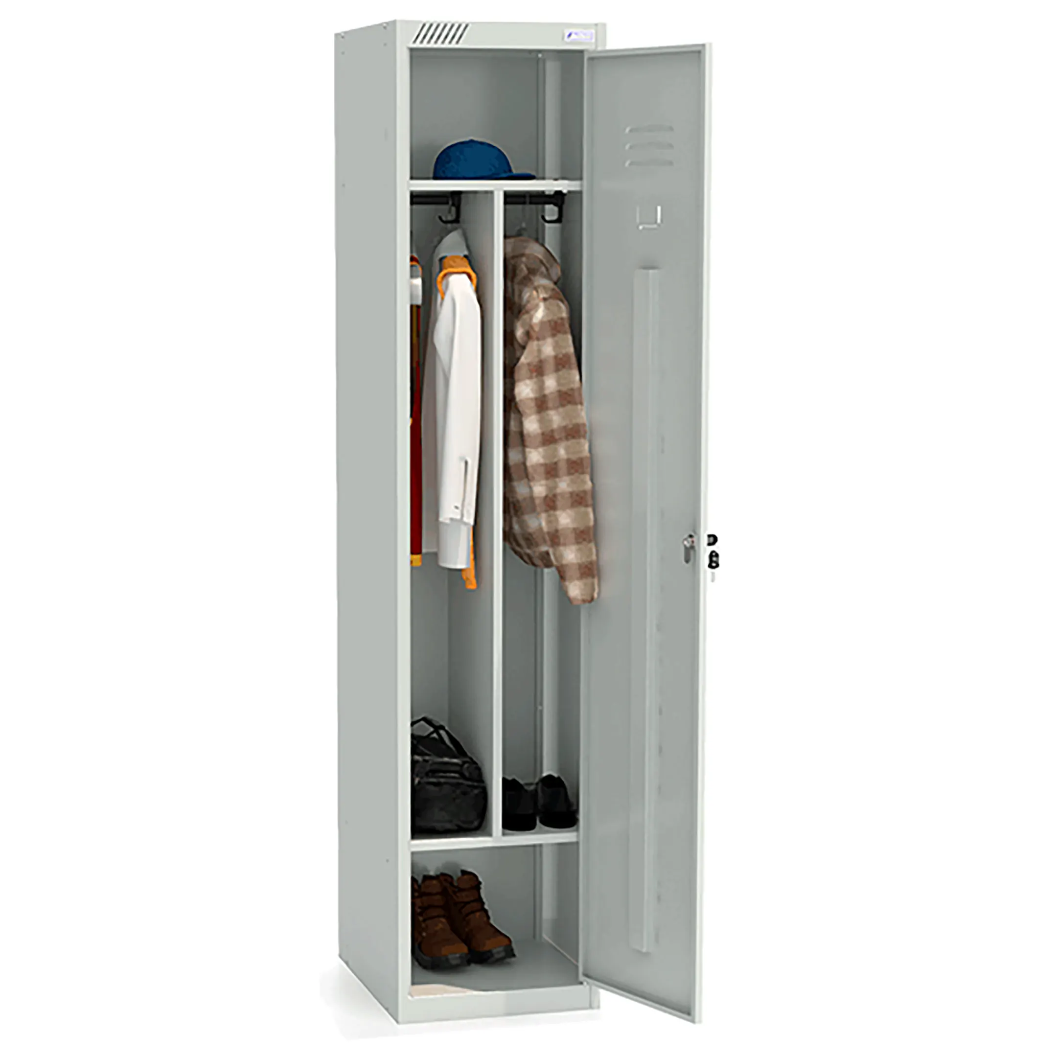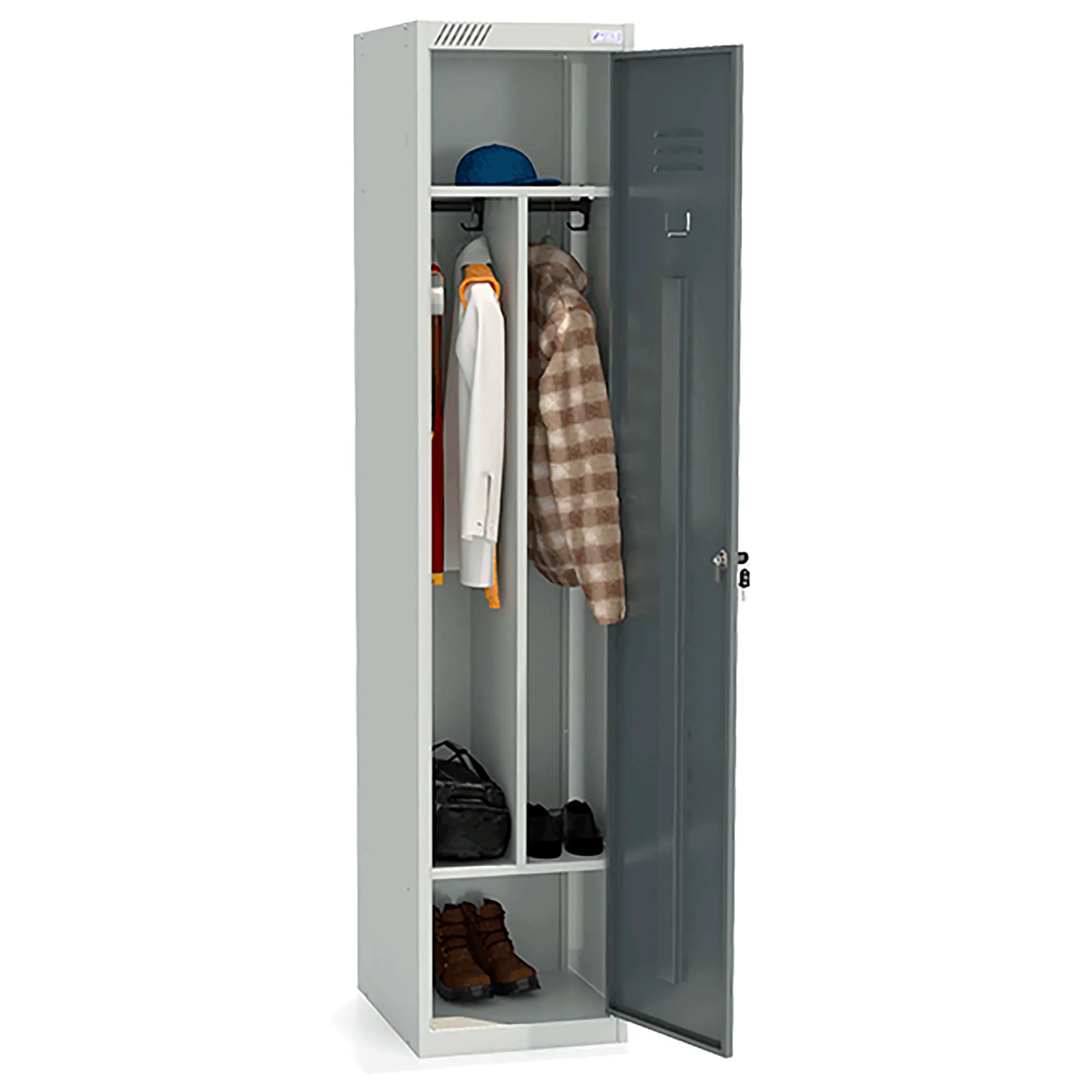- комплектуется вертикальной перегородкой, общей полкой для головных уборов, полкой для обуви, 4 крючками, 2 перекладинами, 1 замком повышенной секретности;