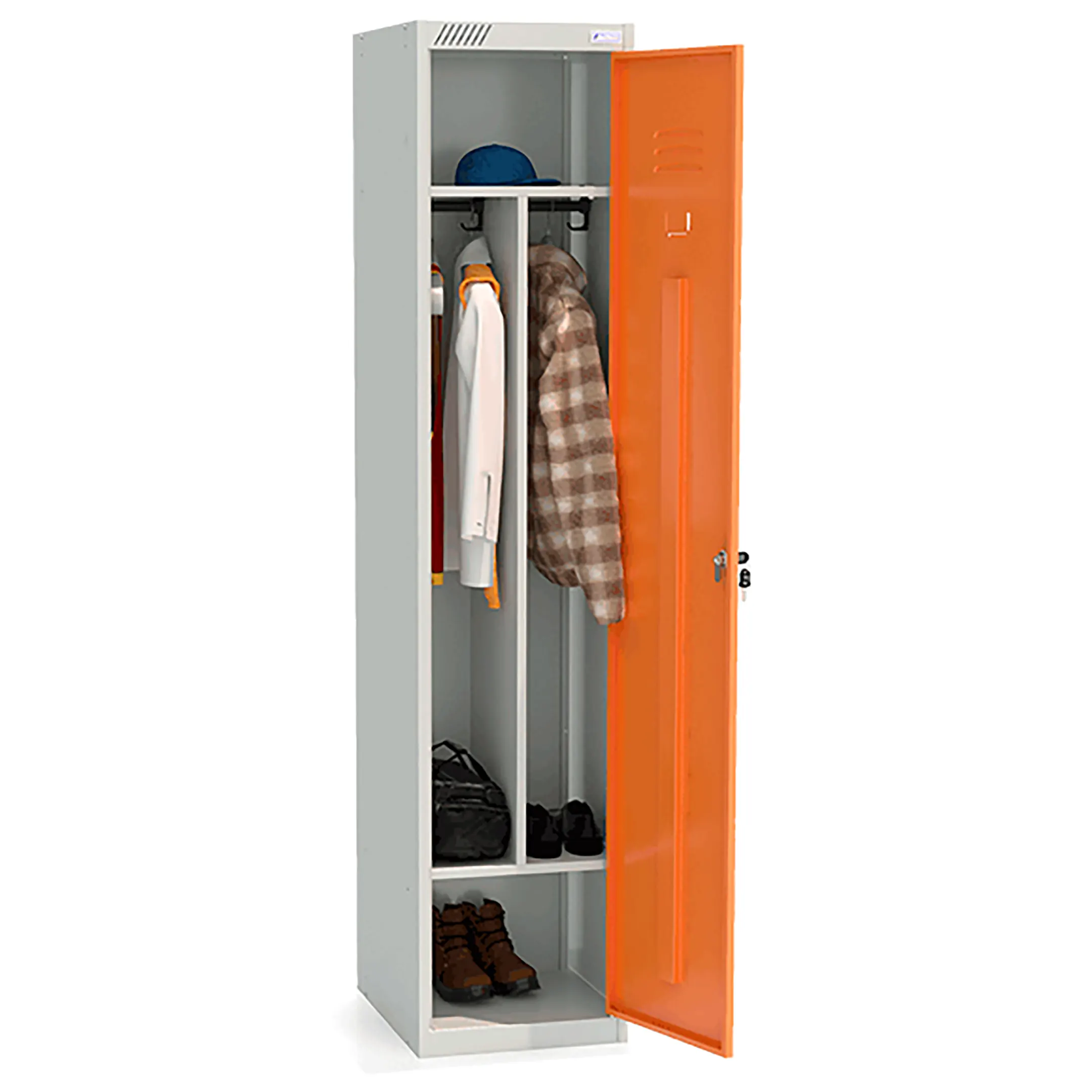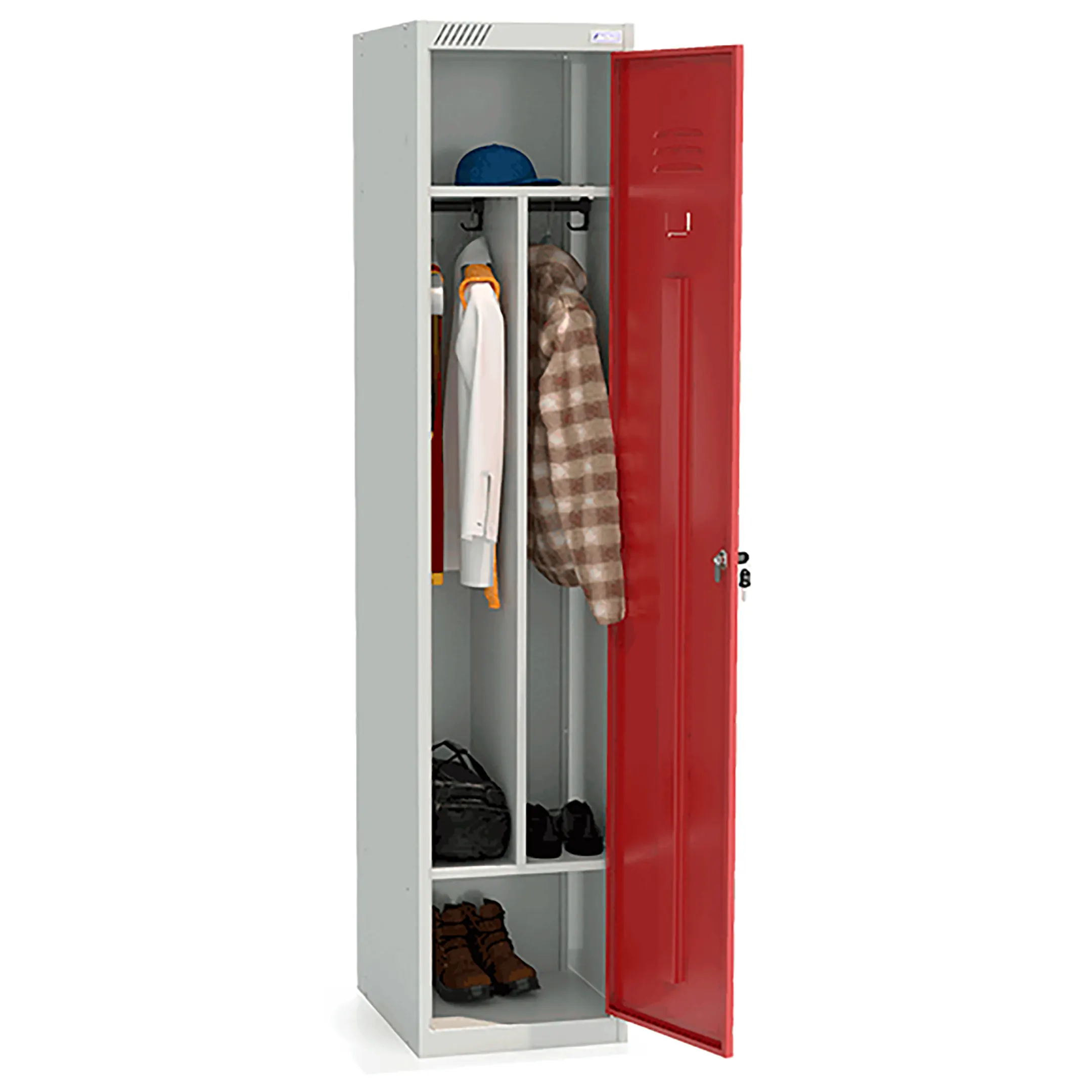 Металлический модульный шкаф для одежды ШРС-11-400 с перегородкой используется для хранения сменной одежды в офисных, производственных, спортивных помещениях.