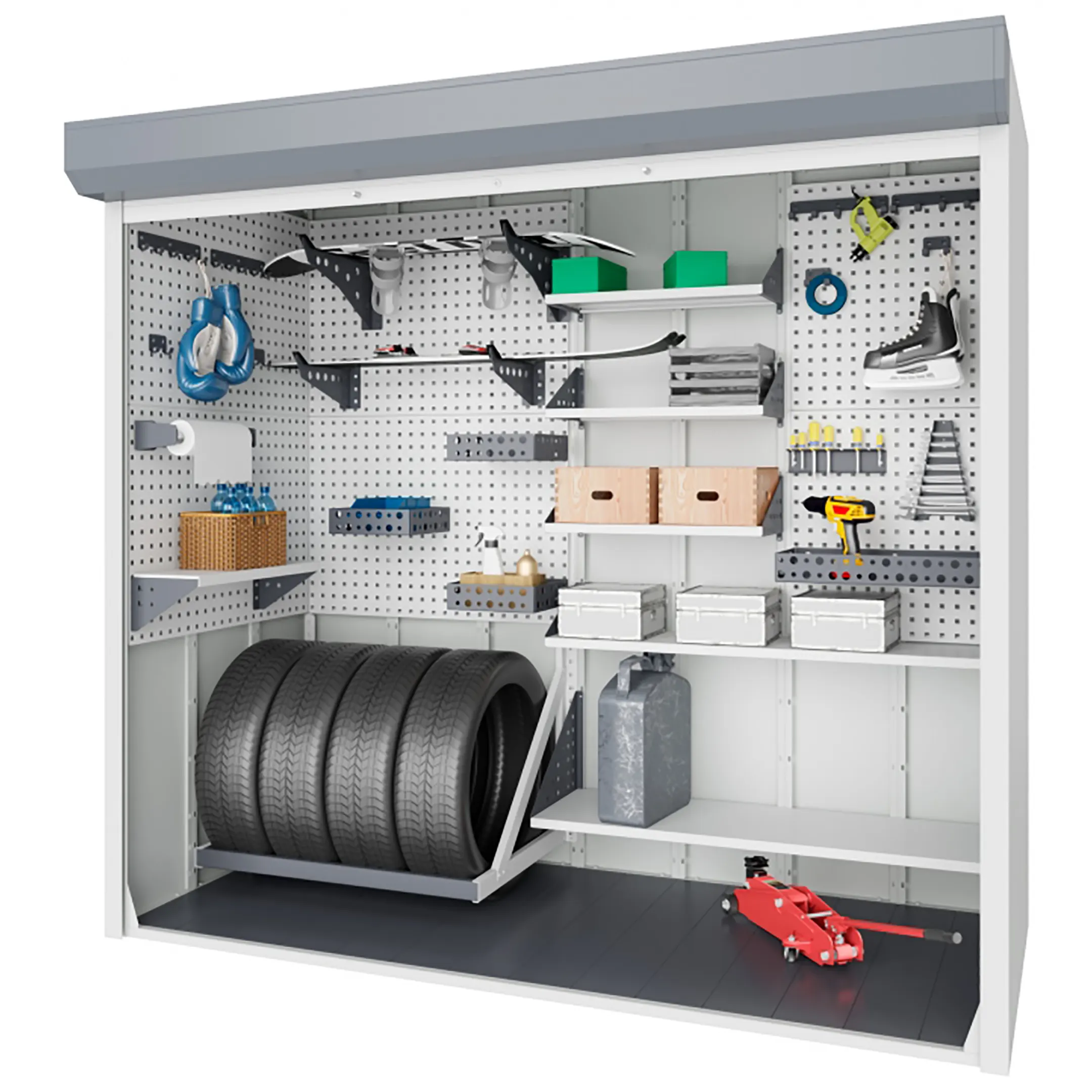 - Экономия пространства в общих зонах — устанавливаясь в ряд, такие шкафы создают упорядоченную систему хранения, избавляя паркинг или подсобное помещение от хаотичного скопления вещей.