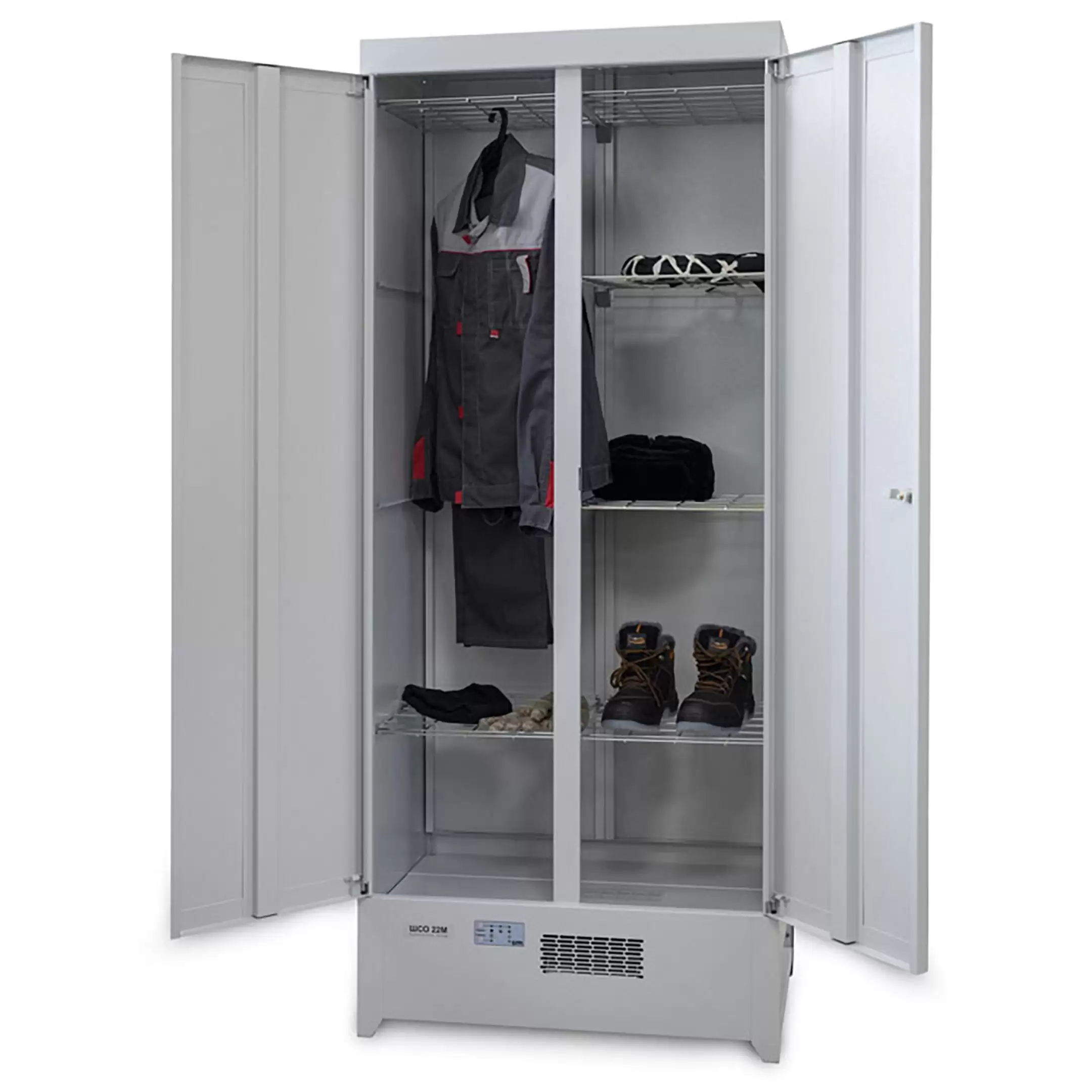- Деликатная и контролируемая сушка — шкаф оснащен системой точного поддержания заданной температуры (до 60°C), что позволяет бережно сушить чувствительные к нагреву материалы, специальную одежду, обувь и оборудование без риска деформации или повреждения.