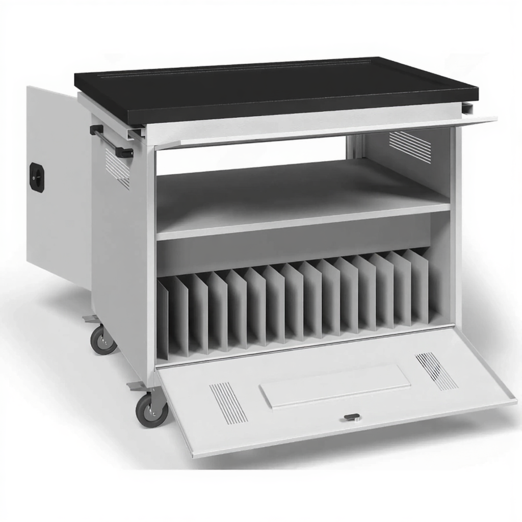 - Четкая организация и экономия времени — каждый ноутбук или планшет размещается в индивидуальном отсеке, что исключает их соприкосновение и повреждение. Процесс раздачи и сбора техники становится быстрым и упорядоченным.
